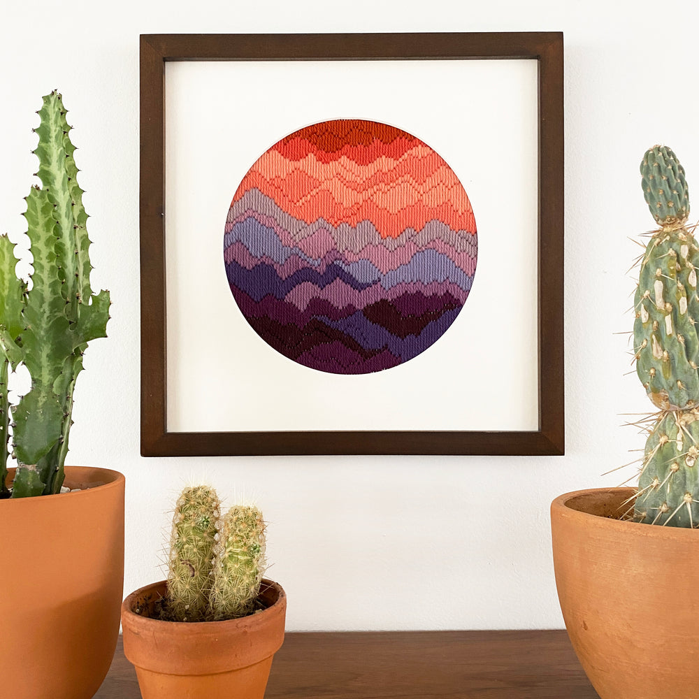 Stitch some dreamy bargello art for your walls! This abstract landscape is stitched in a circular shape that draws you in and transports you far away. Displayed in your choice of frame type or a simple embroidery hoop, it looks amazing as part of a boho gallery wall or alongside your favorite plants.