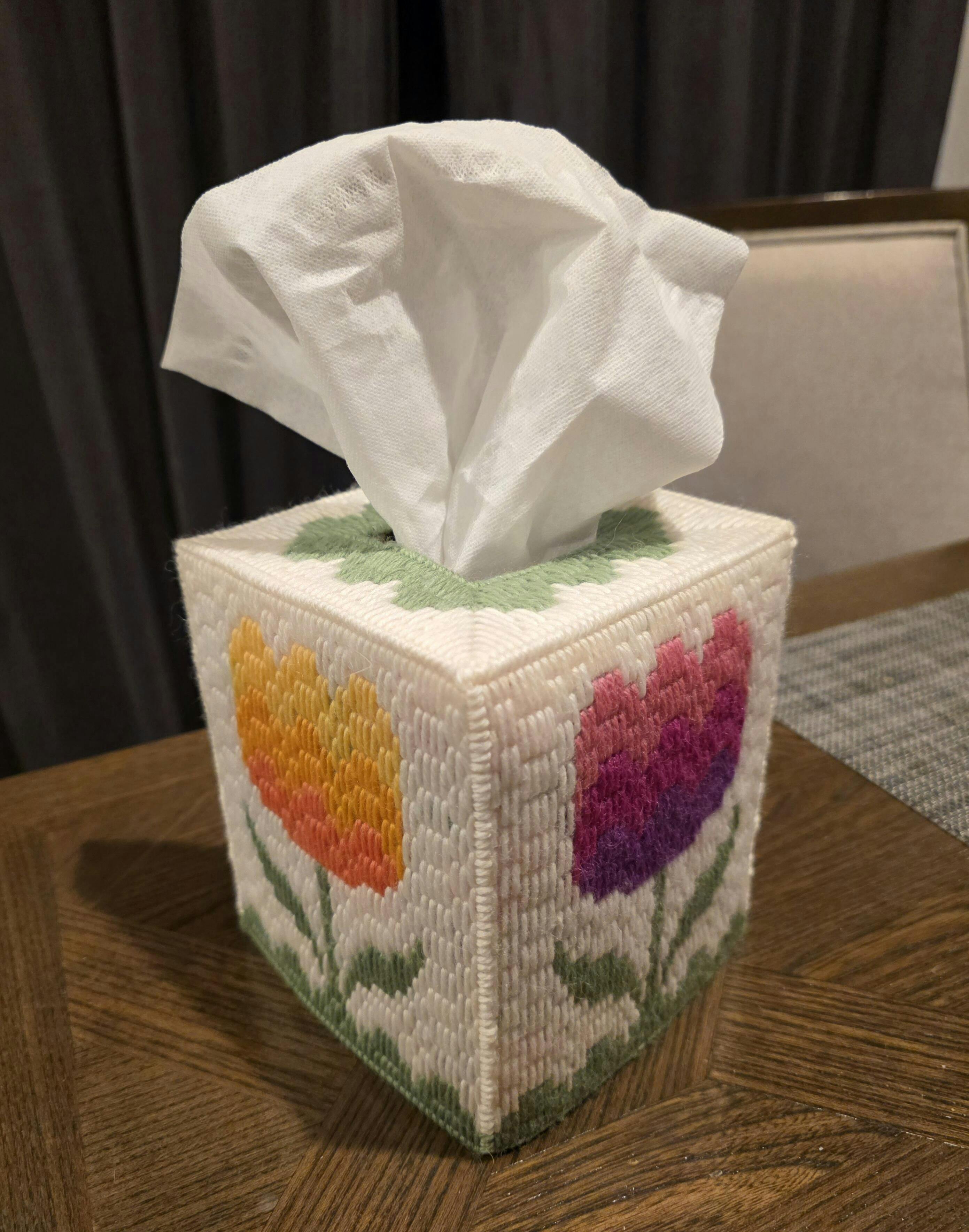 Build your seasonal tissue box collection with our newest addition for spring, Flower Child! This cheery cozy adds a pop of sunny flair to your desk, vanity, or bedside. The bargello flowers are delightfully satisfying to stitch and sooo cute!