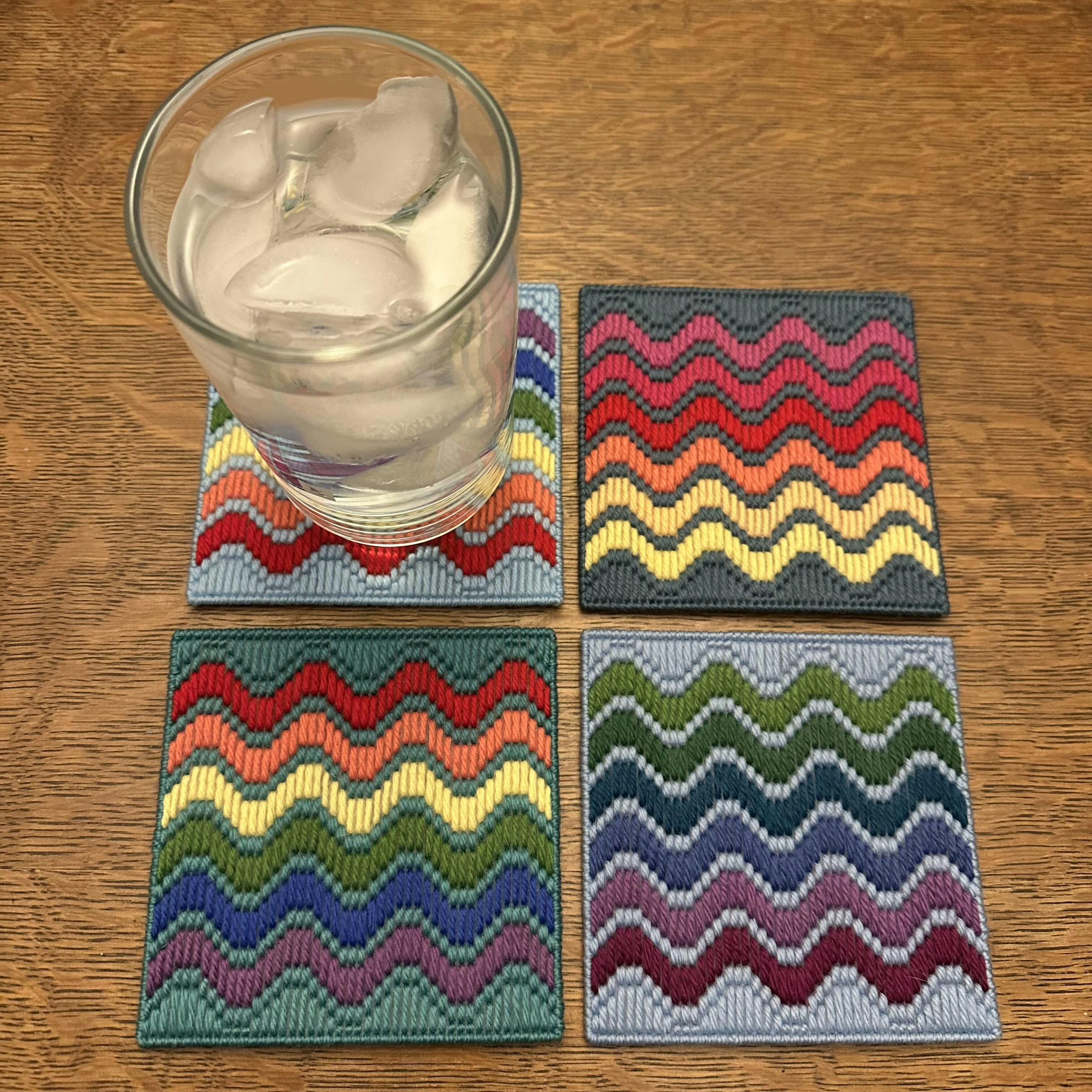 Bring the good vibes to your table with our Happy Waves Coasters, designed to pair perfectly with our Happy Hour Tray. Featuring a groovy wave stitch pattern and a retro-gradient color palette, this set is a joy to stitch and even more fun to show off. Whether you're hosting or just sipping solo, these coasters bring a little extra happiness to every surface.